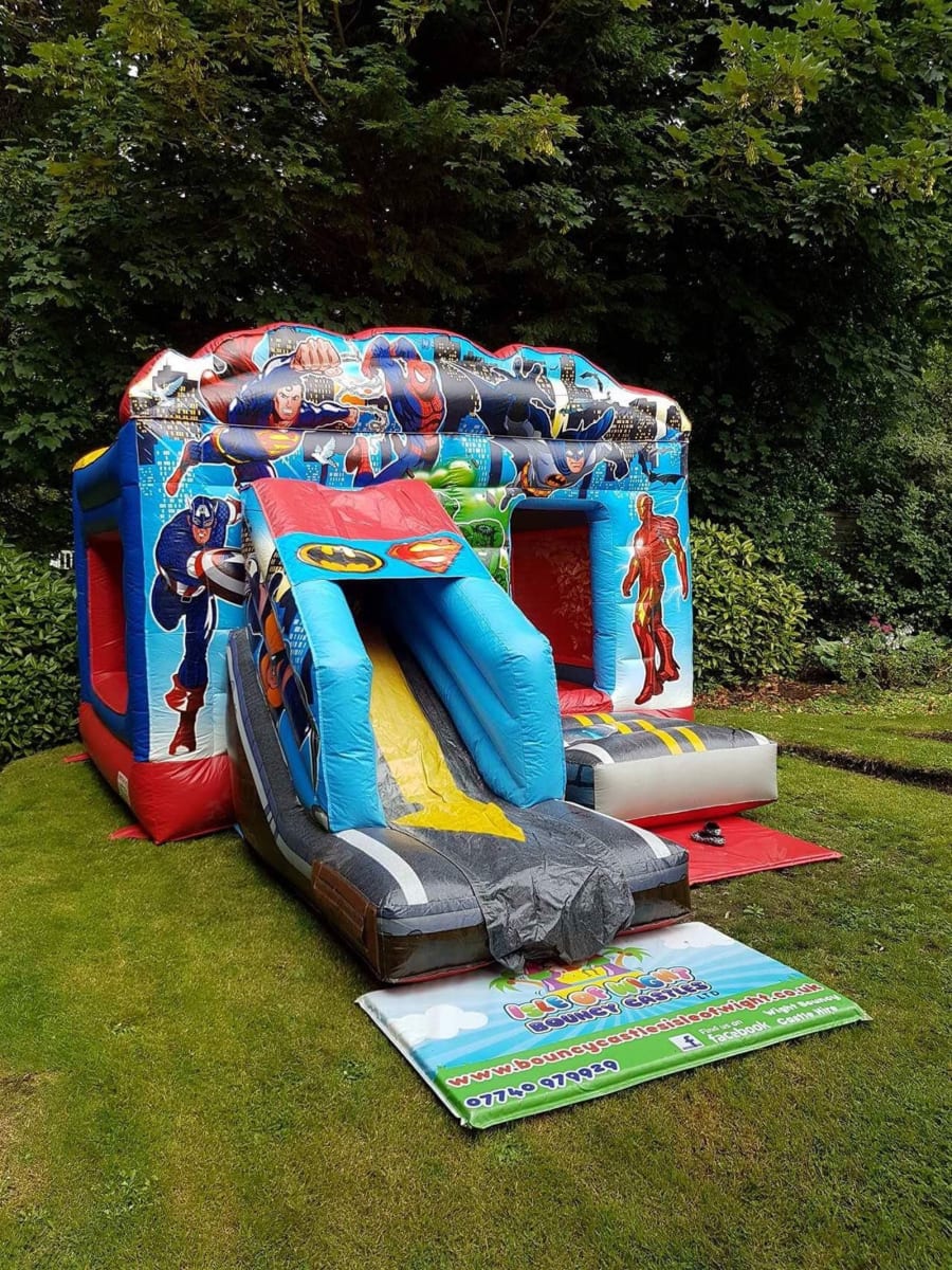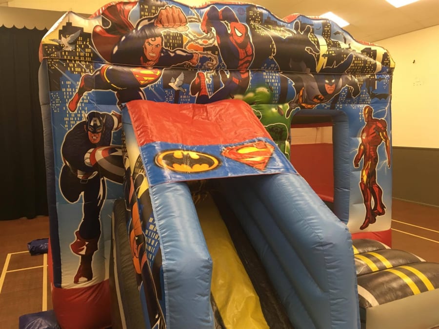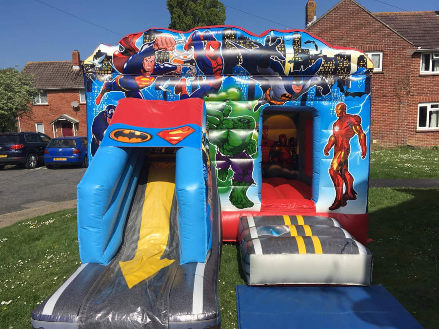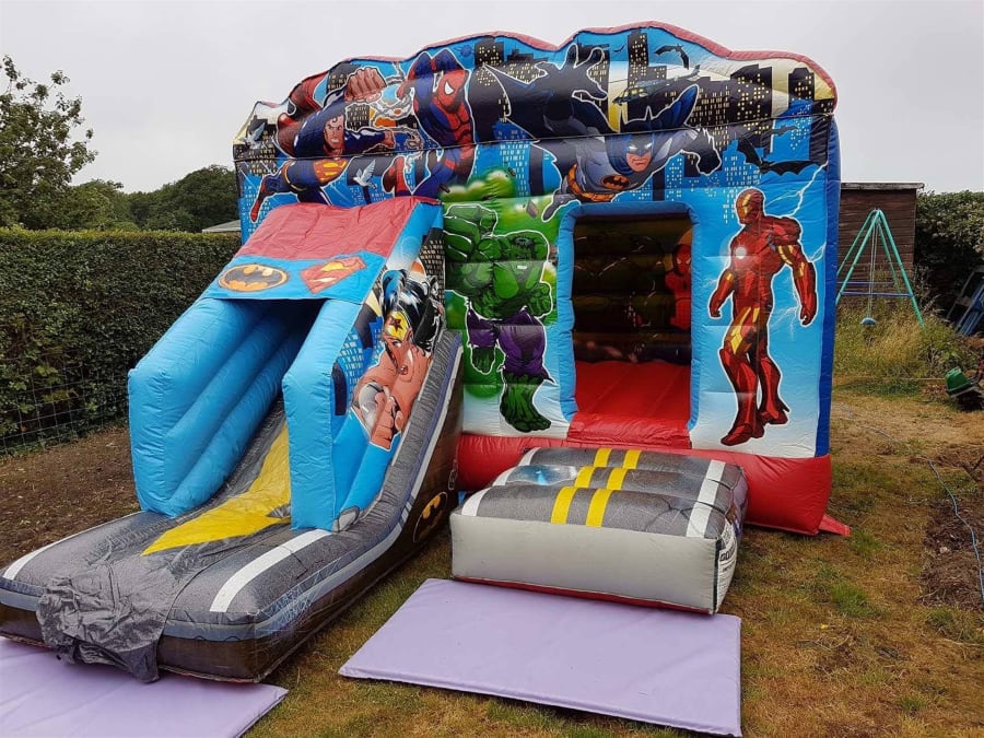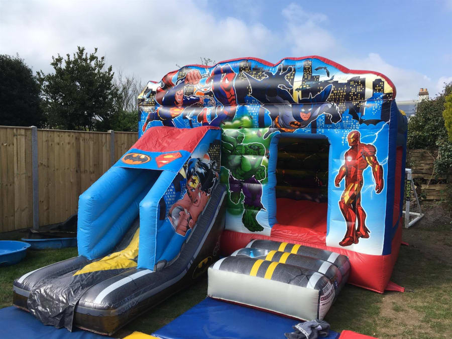Do you have a superhero fanatic? Then this superhero bouncy castle with slide is all you need!