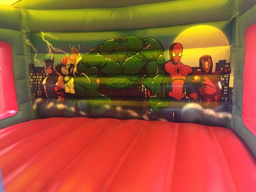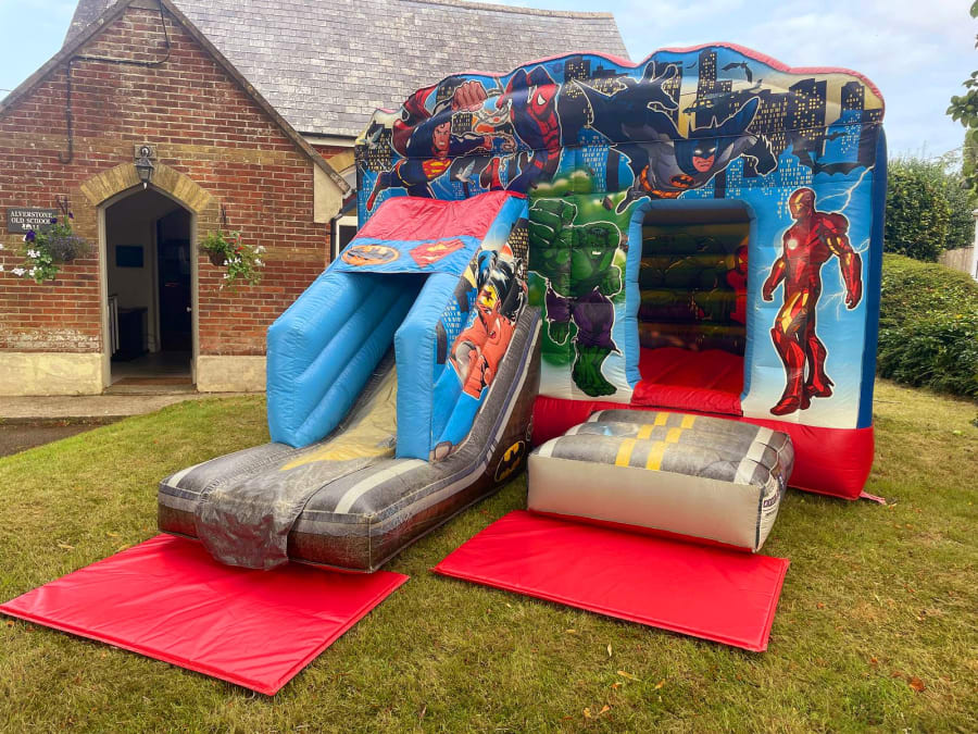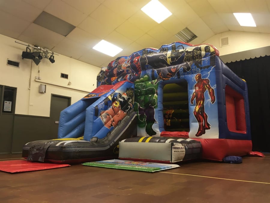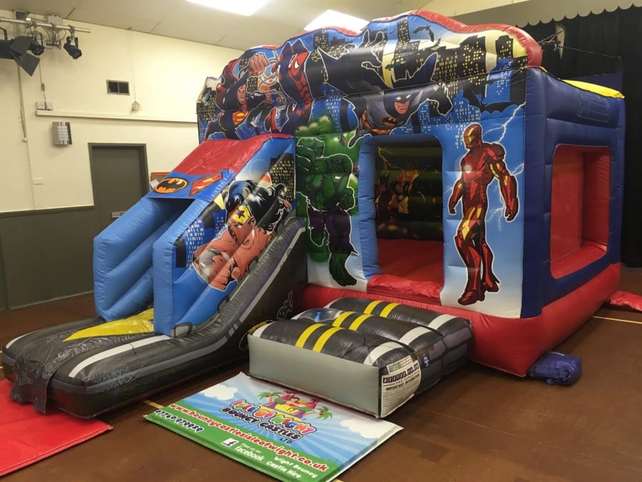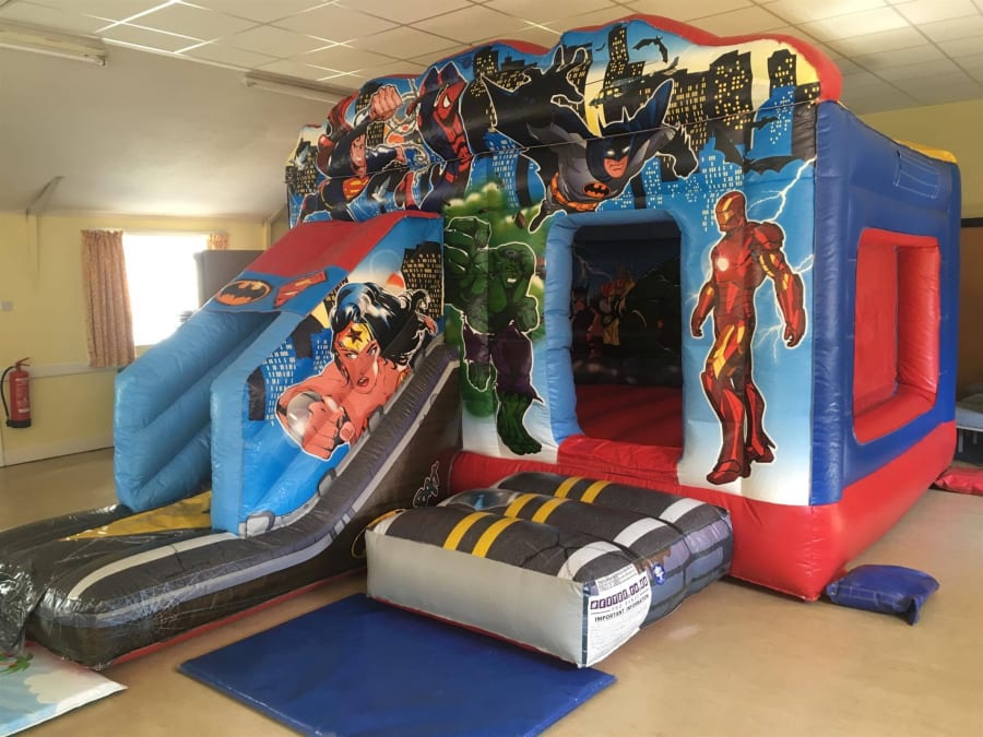 Do you have a superhero fanatic? Then this superhero bouncy castle with slide is all you need!