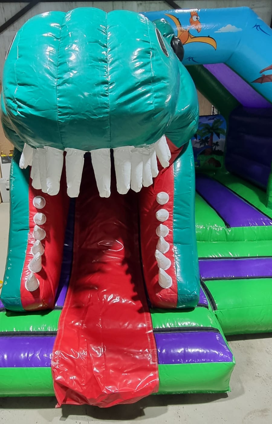 This 3D Dino castle is the perfect addition to any Dinosaur themed party, with its large green head and giant inflatable teeth, no child can resit sliding out of the Dinosaurs mouth!