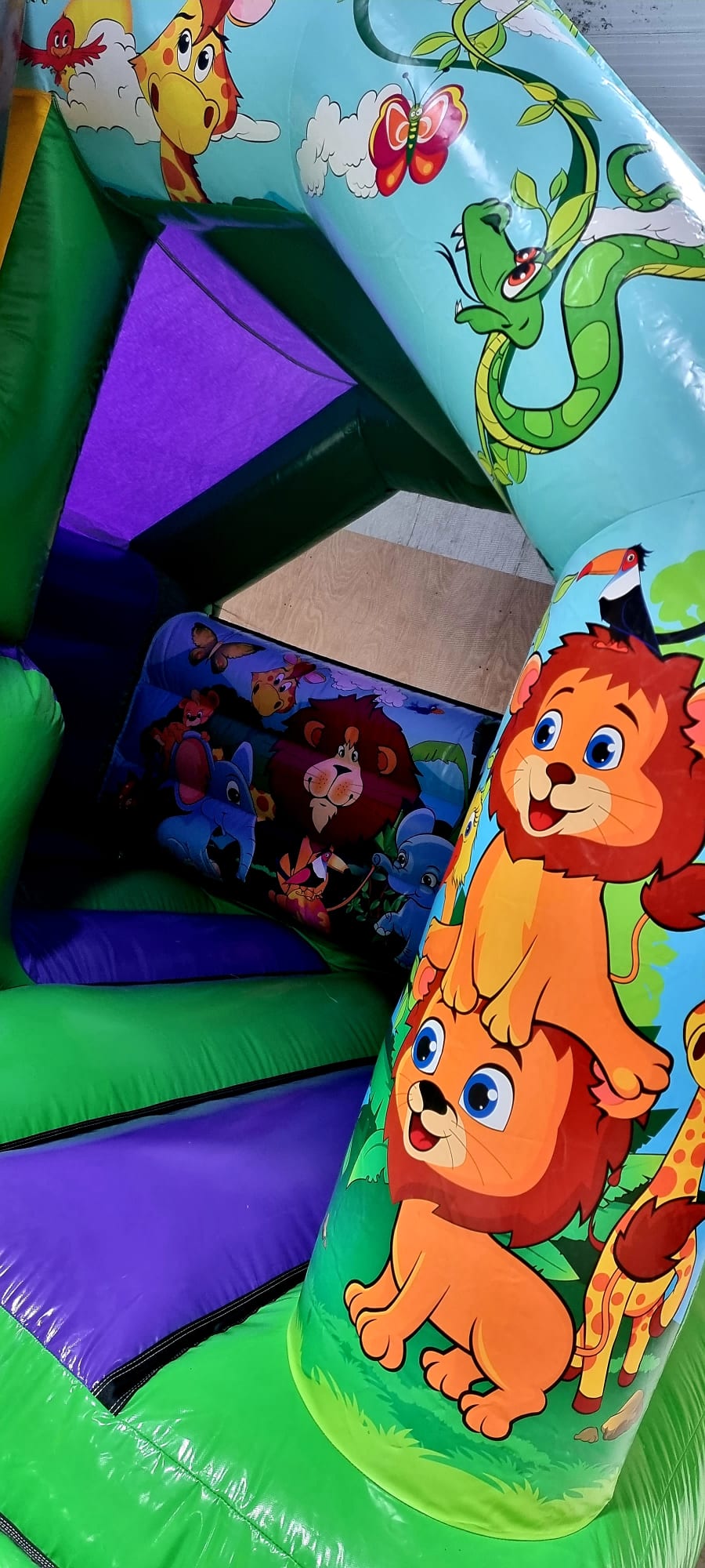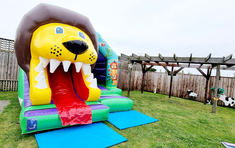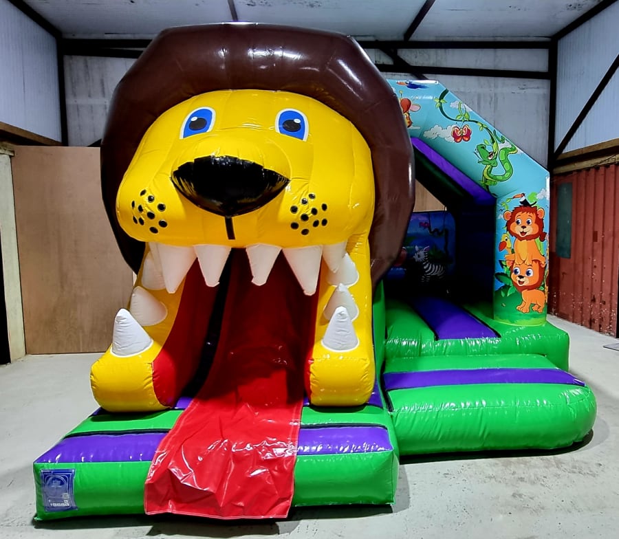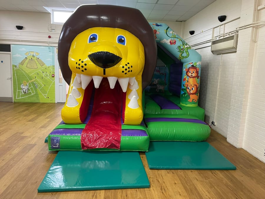 Bright colours, big blue eyes and pearly white teeth, this lion bouncy castle is the perfect addition to any special day.