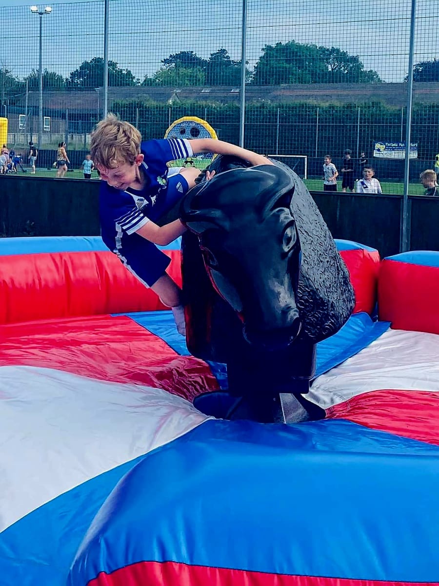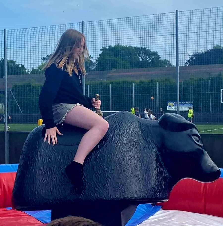 The aim of the game?- jump on, hold on tight and see if you can out ride the bull through the spinning and bucking.